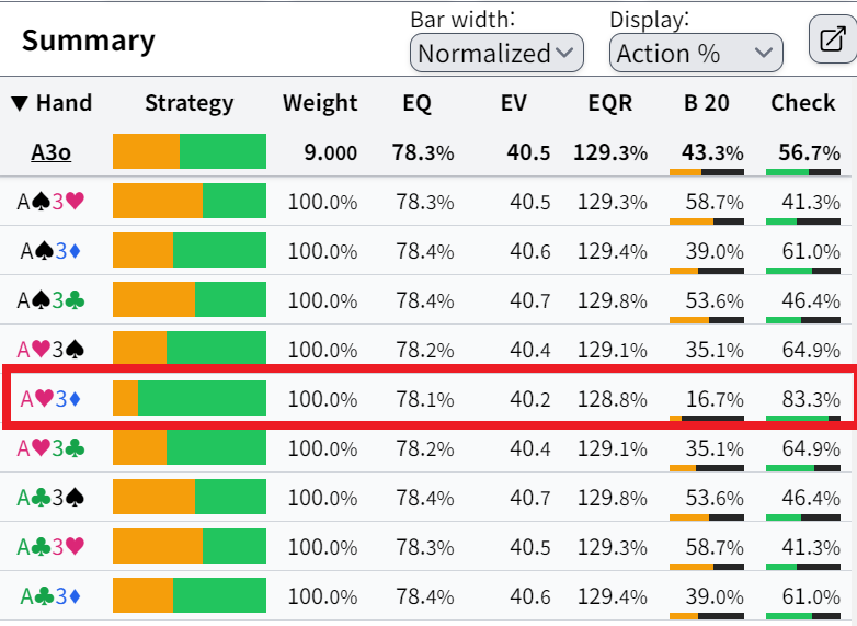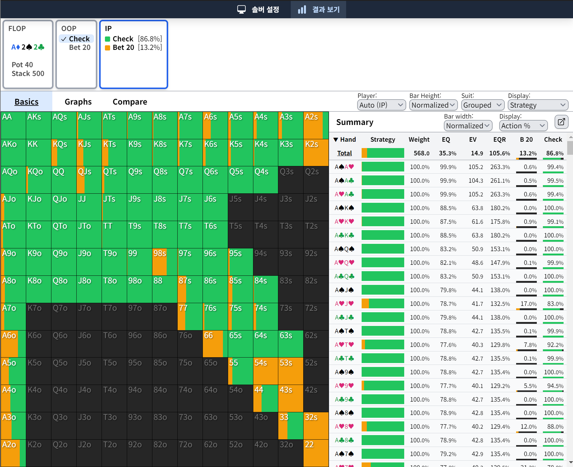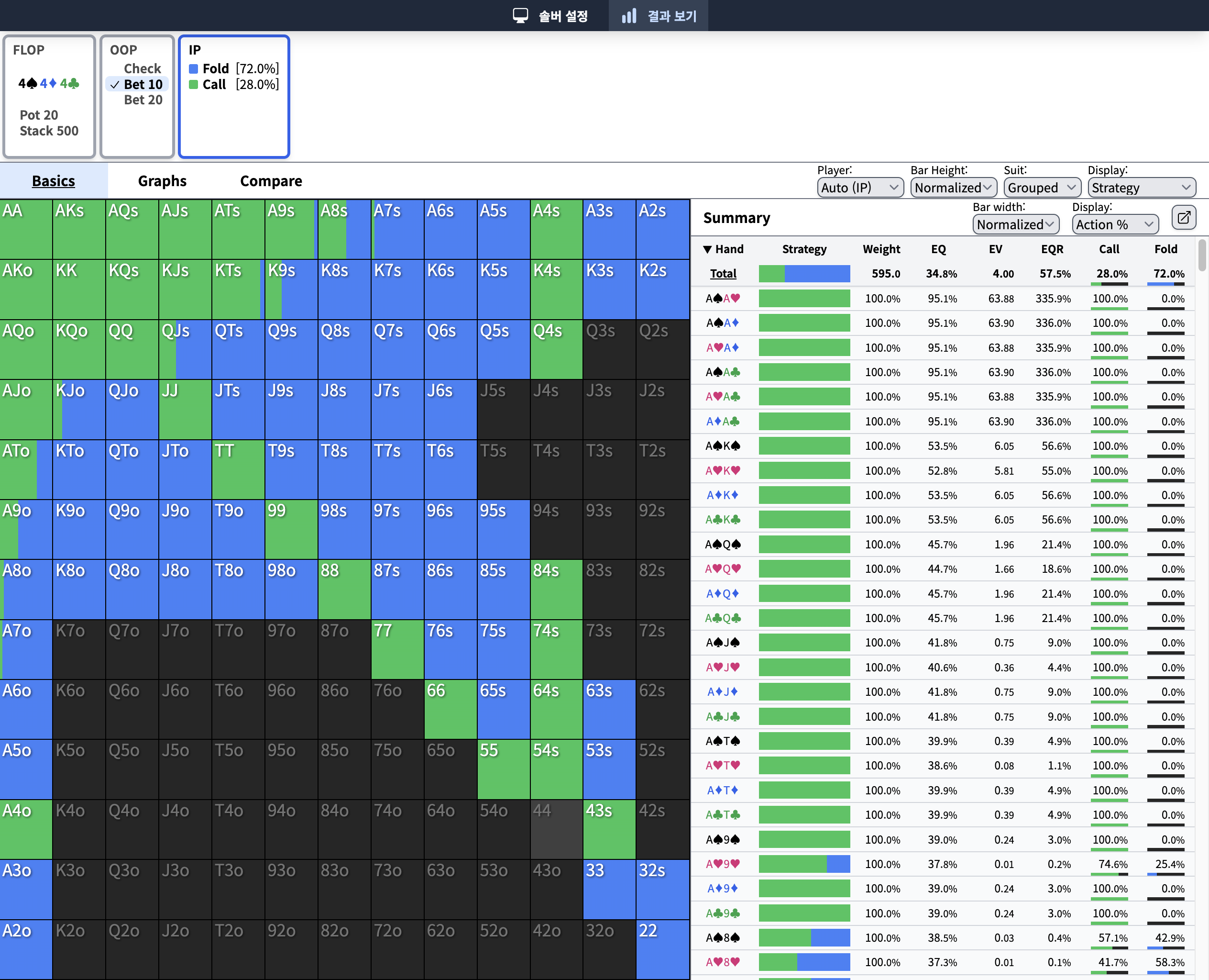 이런 식으로 솔버를 이용해서 나의 핸드별 벳 사이즈와 승률(EQ)을 알 수 있습니다.
