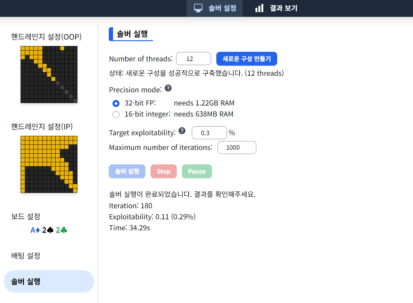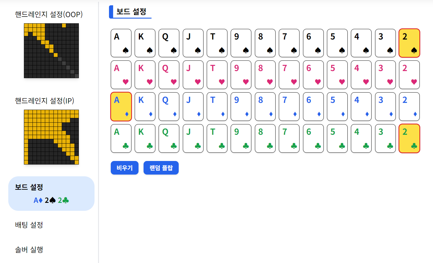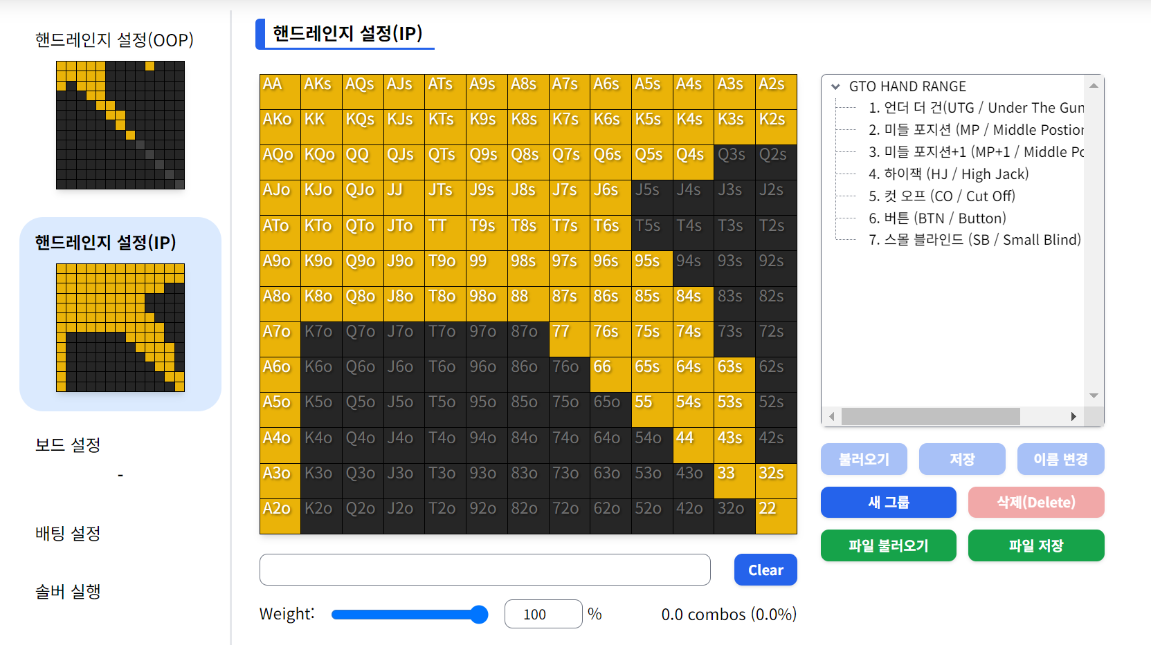 먼저 위 OOP 포지션(선 베팅)과 IP 포지션(후 베팅)의 핸드 레인지를 선택해 줍니다.