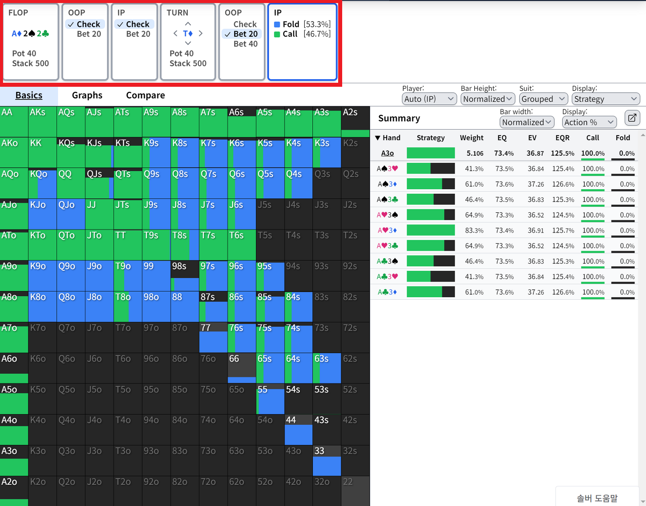 IP의 핸드 레인지에선 53.3%의 빈도수로 폴드를 권장하고 있고, 46.7%로 콜을 권장하고 있습니다.