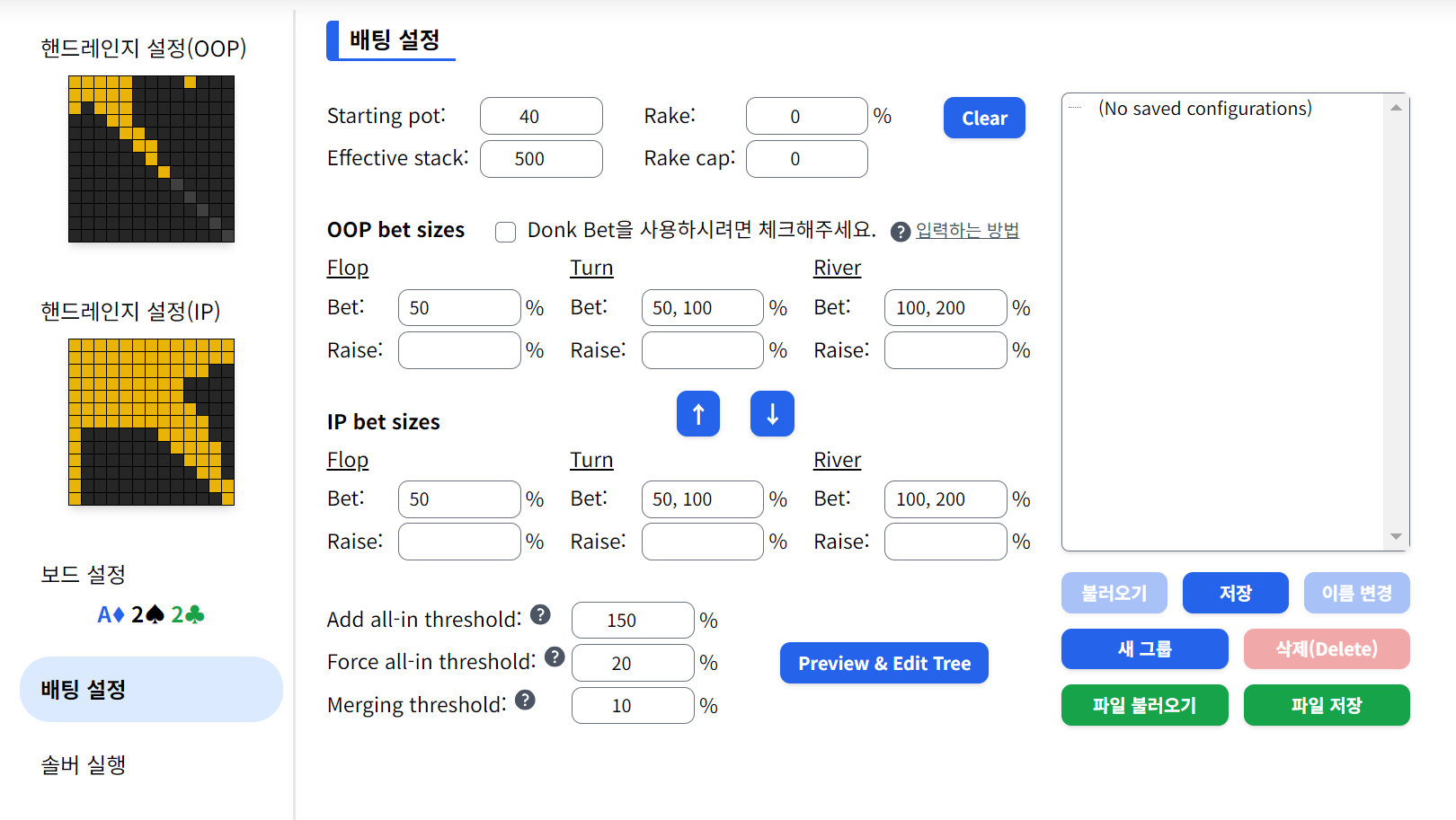 GTO 솔버 메뉴에 들어오면 이렇게 설정하는 화면이 나오게 됩니다.